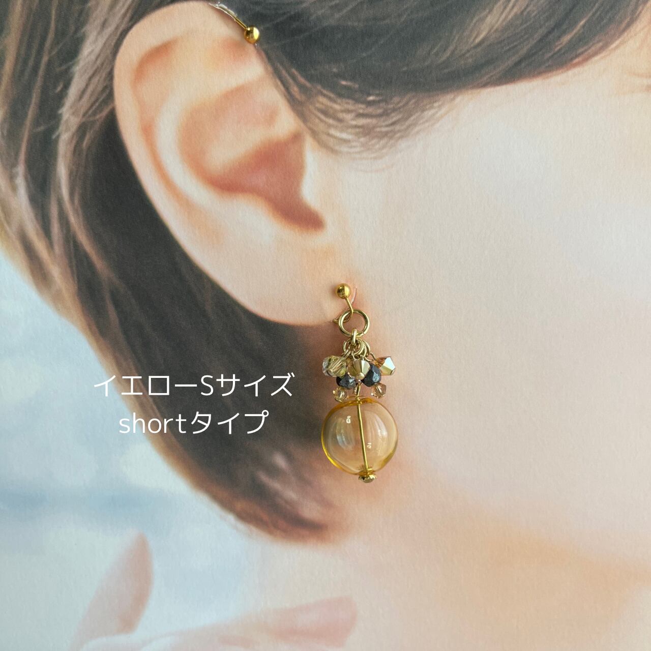 イエローのガラスボールビーズにカラフルなクリスタルビーズ(オレンジ、トパーズ、クリア、グレー)を合わせて、色々なカラーの装いにお使いいただけるように製作しました。それぞれのカラーが差し色になっていて、光が透けて通るイエローのガラスビーズの表情も変化して、さまざまな印象になります。