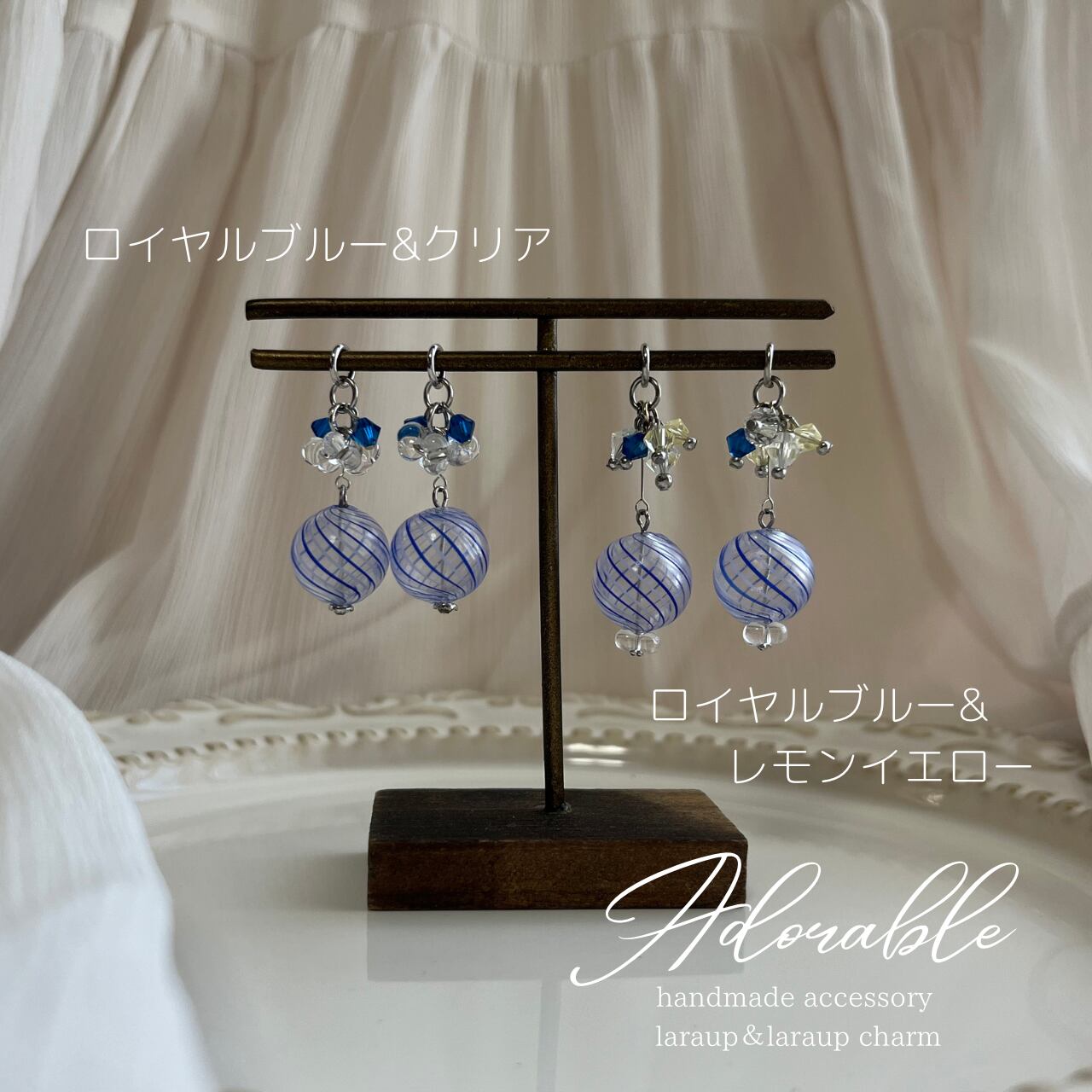デザインは2タイプ。添えられてる、クリスタルビーズがロイヤルブルー×クリアのものとロイヤルブルー×レモンイエロー。全長の長さも少し変えてあります。お好みのものを選んでみてください。