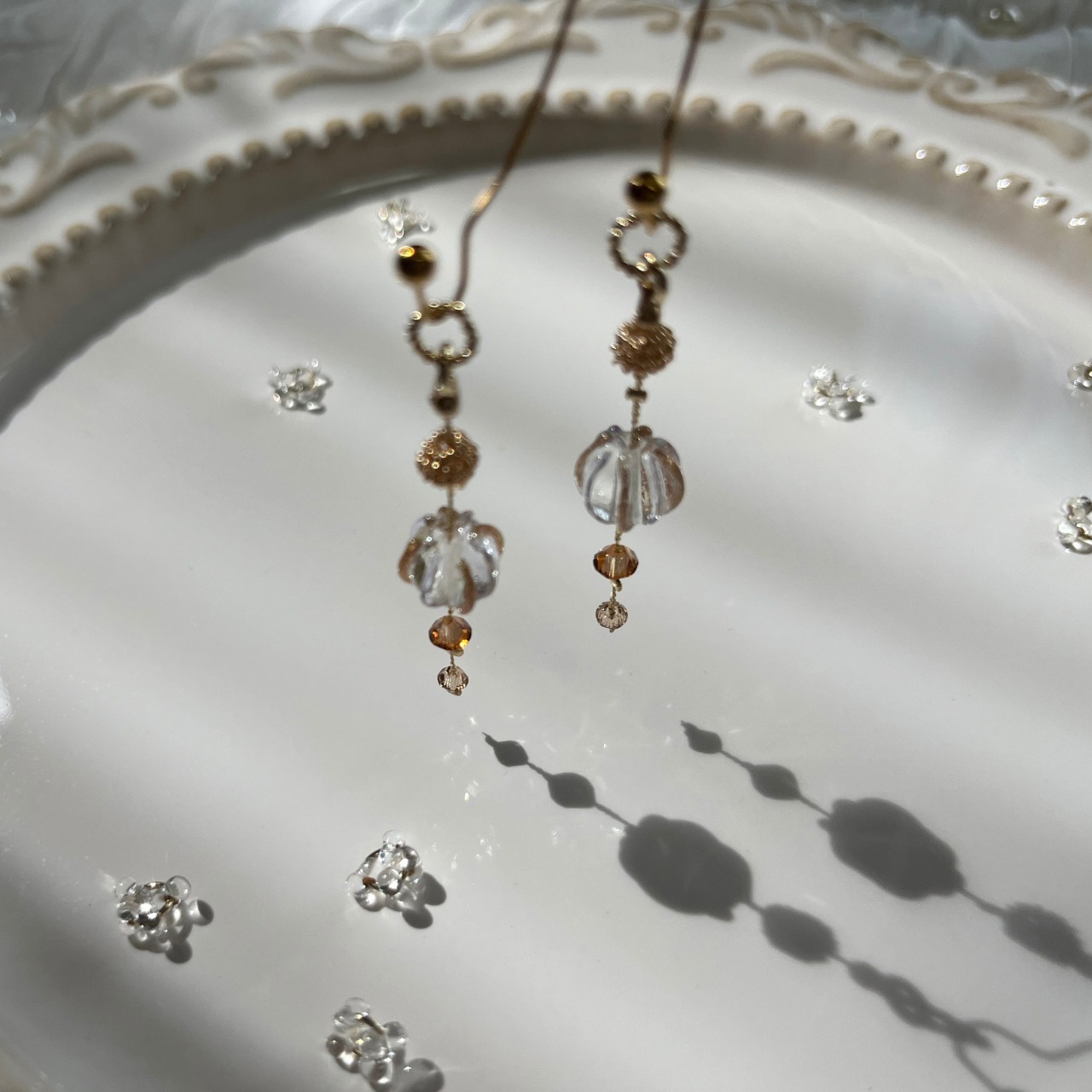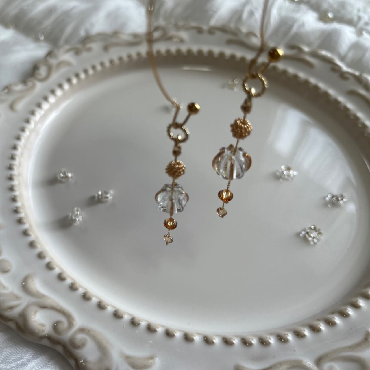 ハンドメイドのため、制作時の小さな傷等、気になる方はご購入をお控えください。また、繊細な作りのため、着脱時のお取り扱いには十分ご注意いただき、優しくお付き合いください。