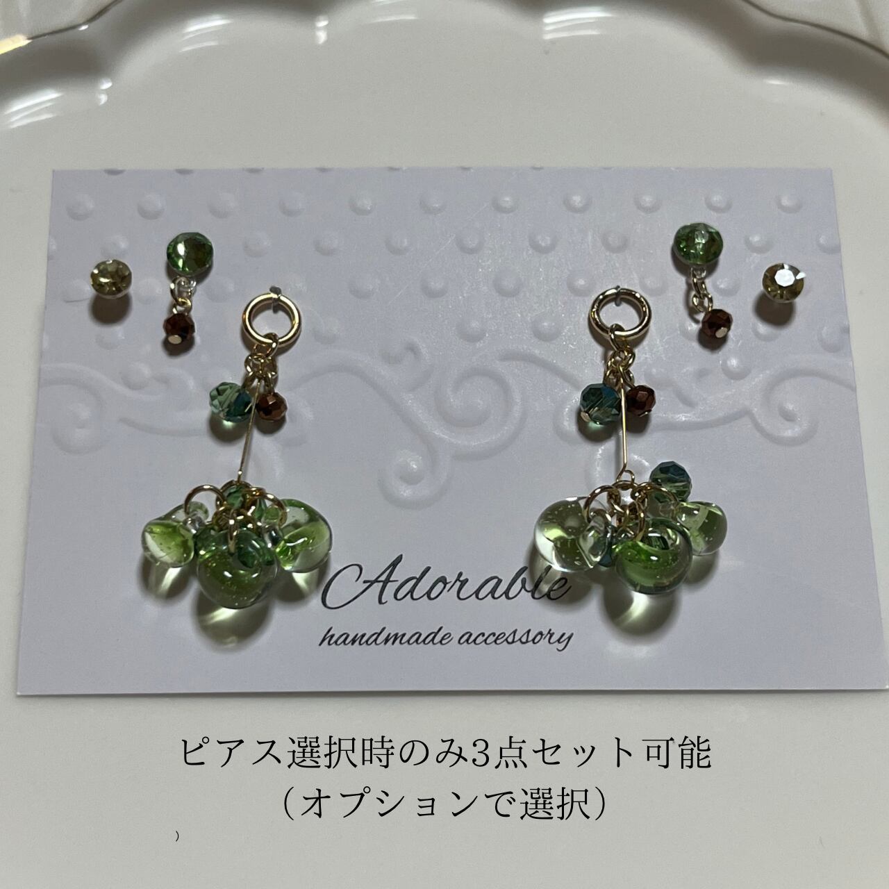 1石のライトイエローのものと、グリーンとメタリックブラウン2石を使ったものを左右一組づつと、メインのドロップビーズひと組みの計3組のセットです。