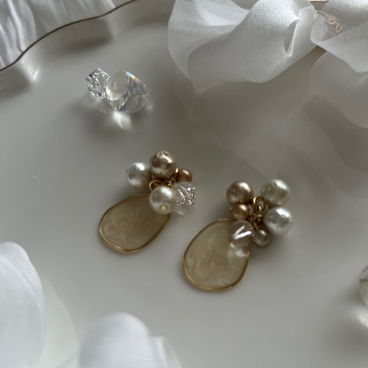 アイボリーのマーブルプレートに、さまざま質感のパールを合わせて、上品なオフホワイトの世界を表現してみました。