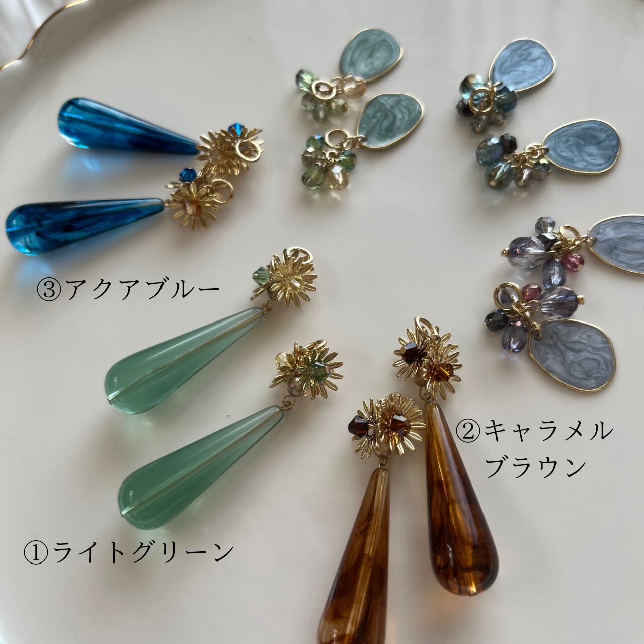 画像はLaraupというイヤーフックタイプ用の金具になっていますが、ピアス.イヤリングでお作りできます。