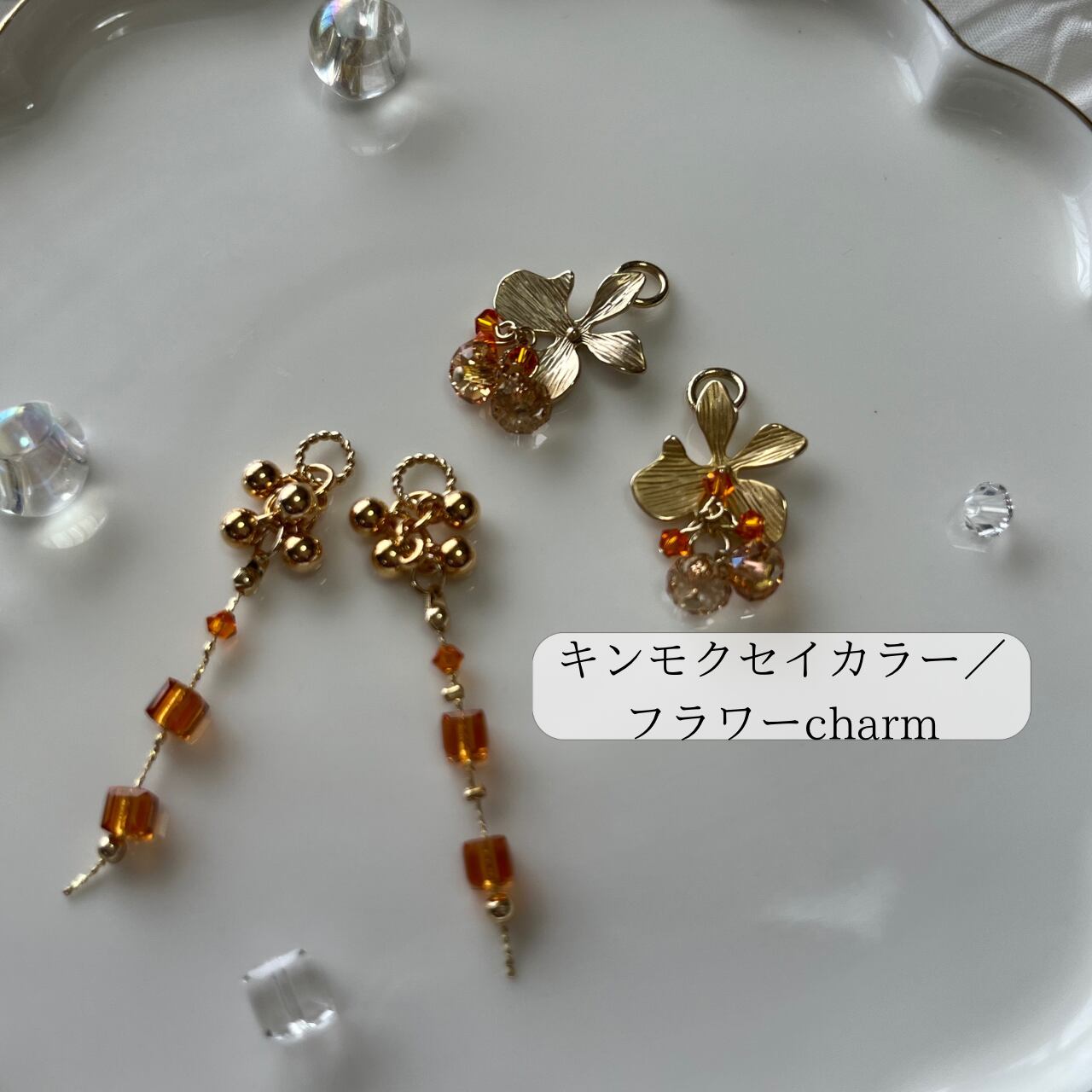 金木犀の香りが恋しくなって、金木犀カラーのビーズを集めてできたcharmです。