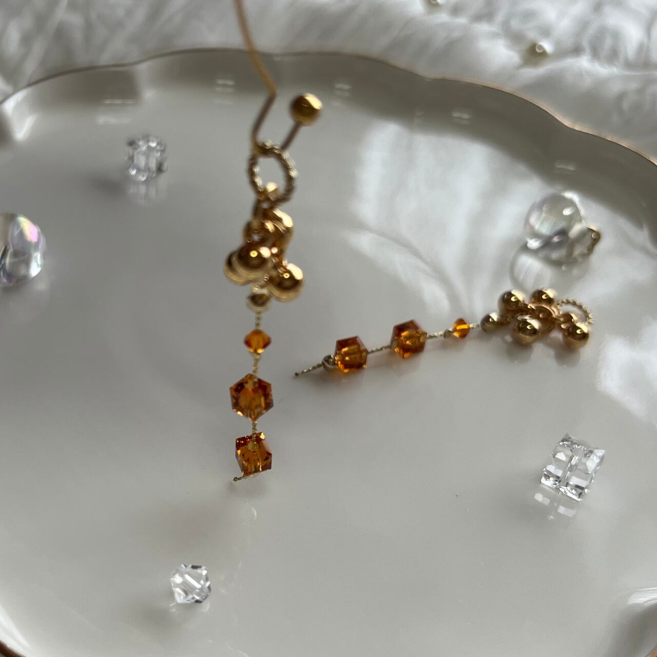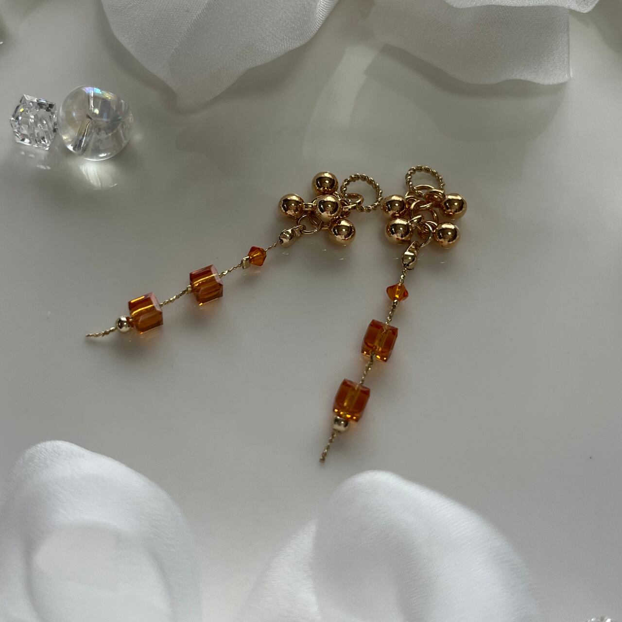 少し珍しい、スクエア型のクリスタルビーズを、チェーンで繋ぎ、ゴールドのつぶつぶビーズを上部にして、少し華やかさを出しつつ、タンジェリンという、赤みがかったオレンジ色を引き立たせています。