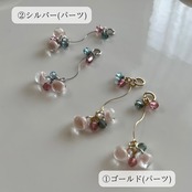 パーツがゴールドとシルバー2タイプで制作していますが、それだけで、違う印象に見えるから、不思議です。イエローベースの方、ブルーベースの方
