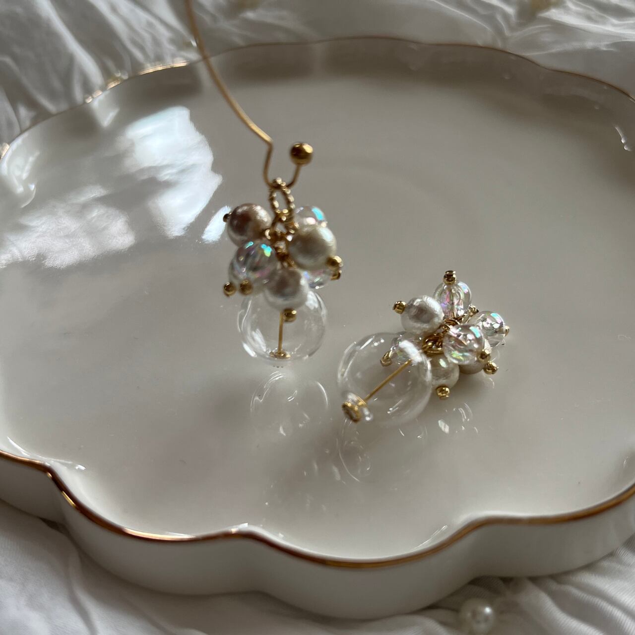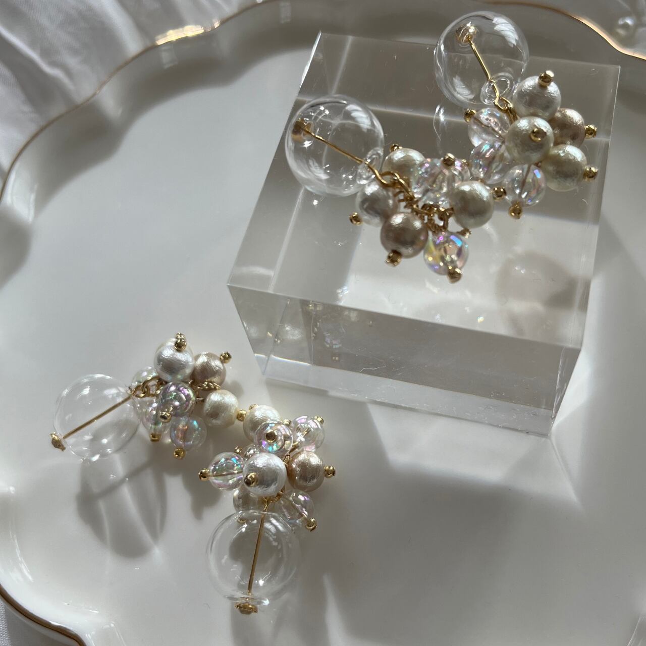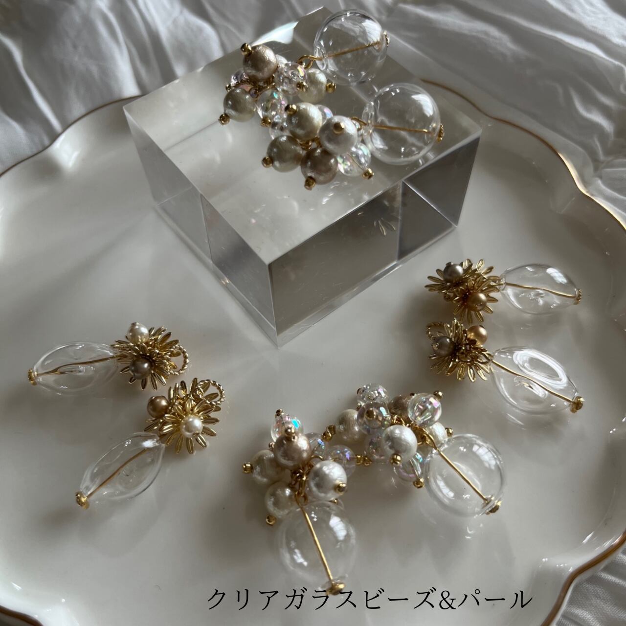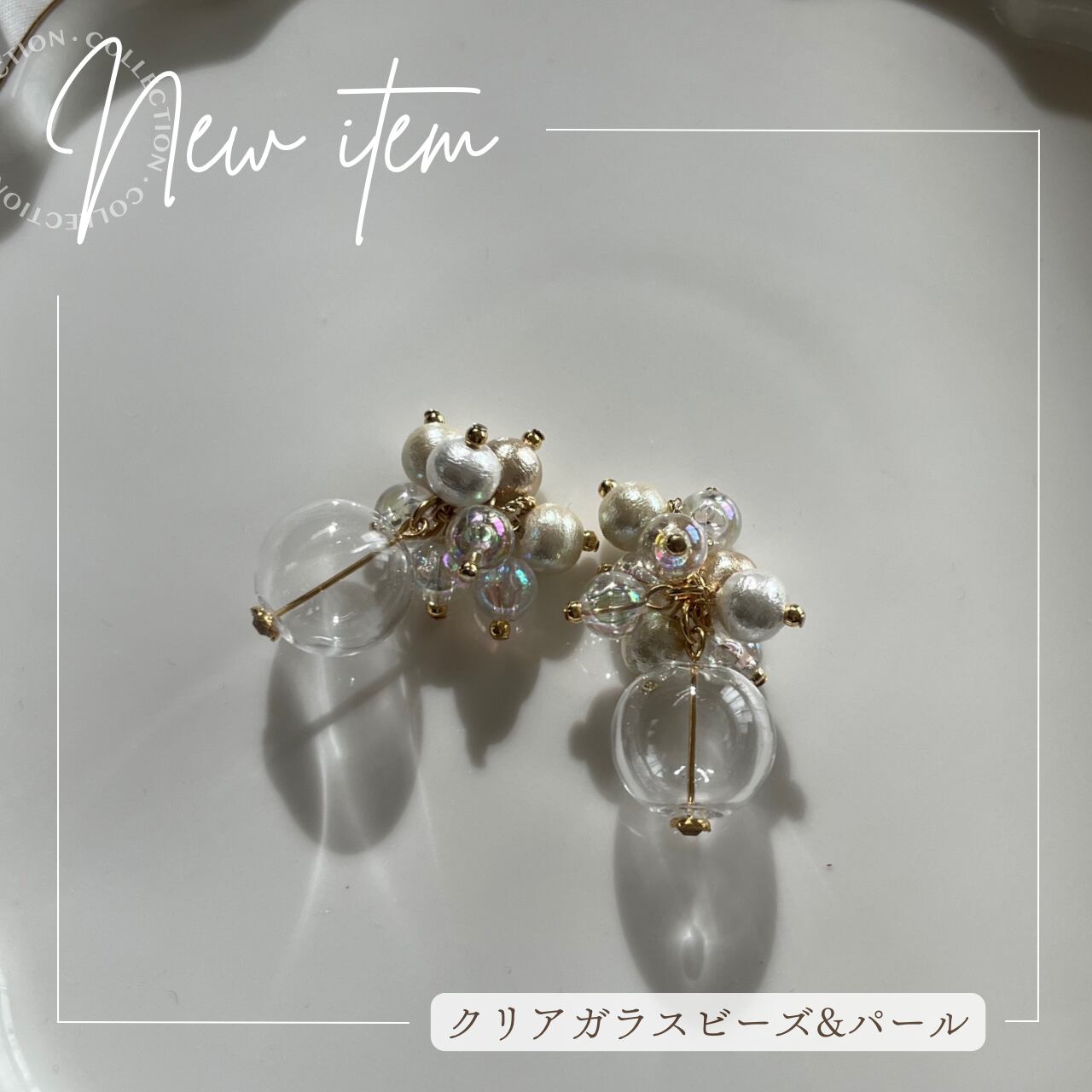 クリアガラスビーズの透明感に、コットンパールの上質感とオーロラアクリルビーズのキラキラ感もプラス。