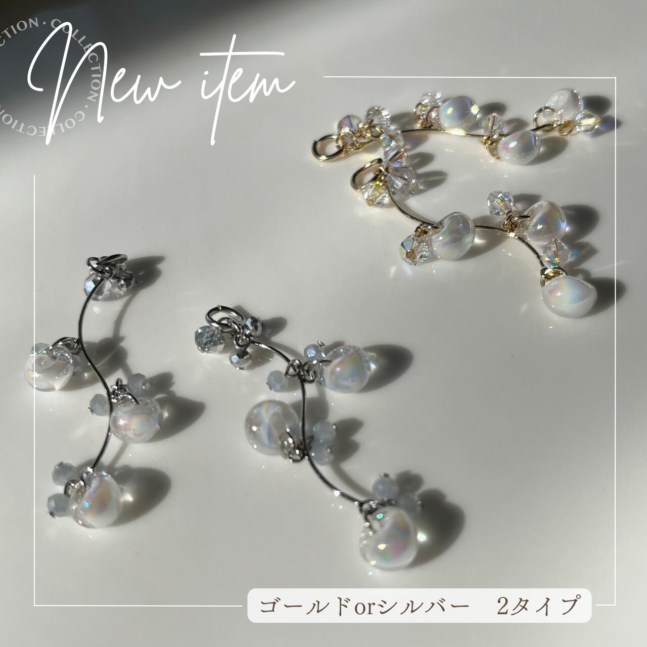 透き通るドロップビーズの中心に入る白の美しさをめーいっぱい感じてもらえると思います。