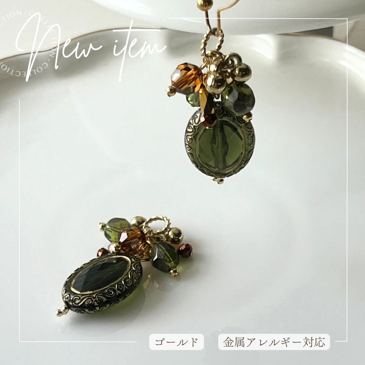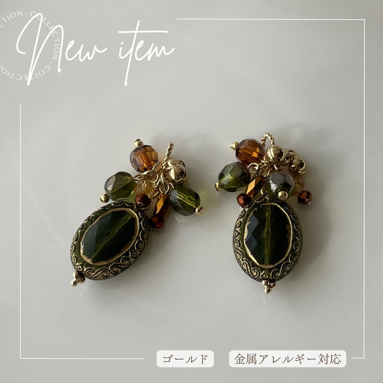 クラシカルなモチーフがとっても素敵なgreen系のcharmです。クラシカルモチーフのドイツビーズをメインに、さまざまな種類のパールとガラスビーズで少しハイグレードな印象に仕上げています。