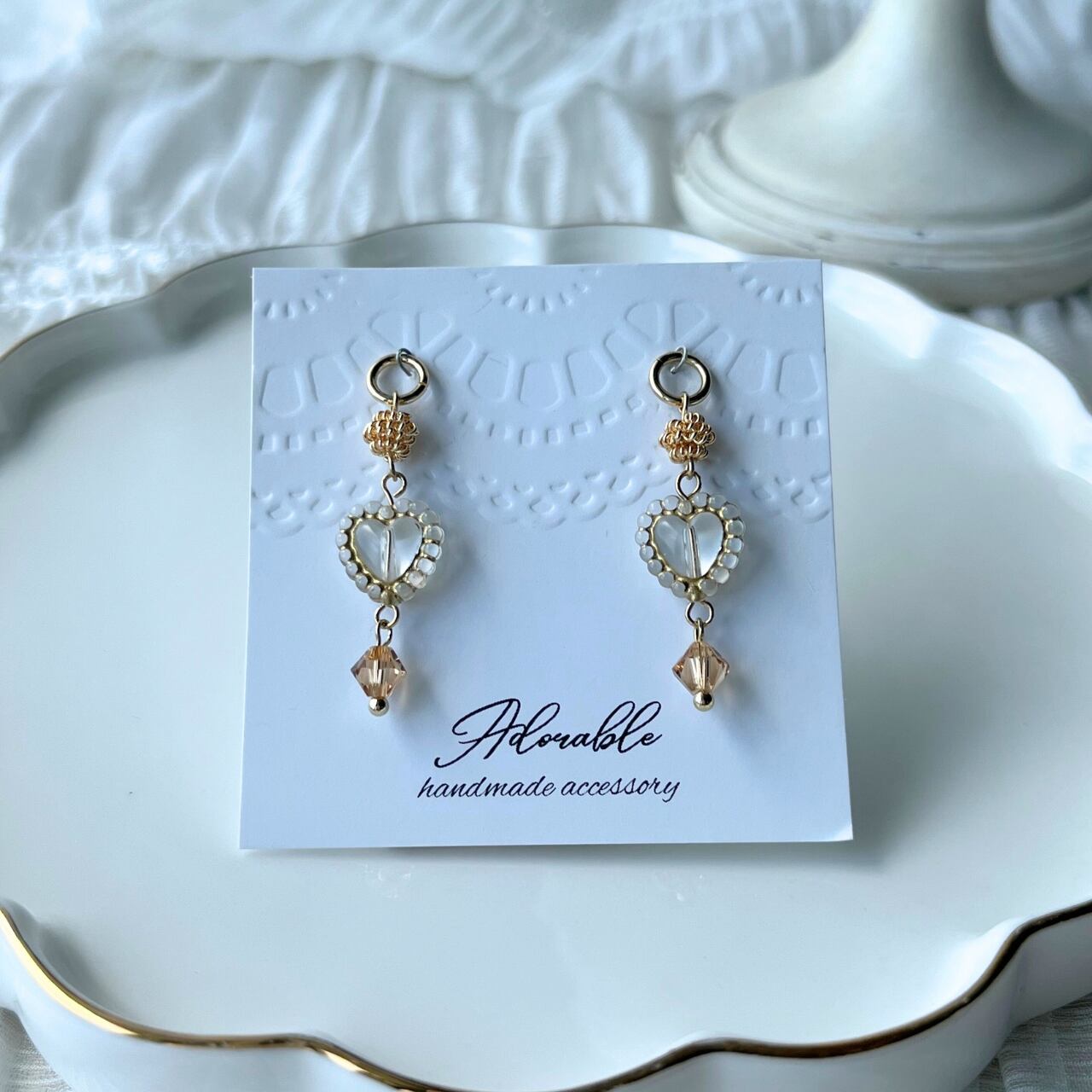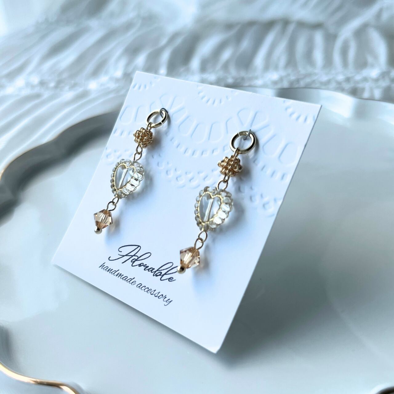 ハンドメイドのため、制作時の小さな傷等、気になる方はご購入をお控えください。また、繊細な作りのため、着脱時のお取り扱いには十分ご注意いただき、優しくお付き合いください。