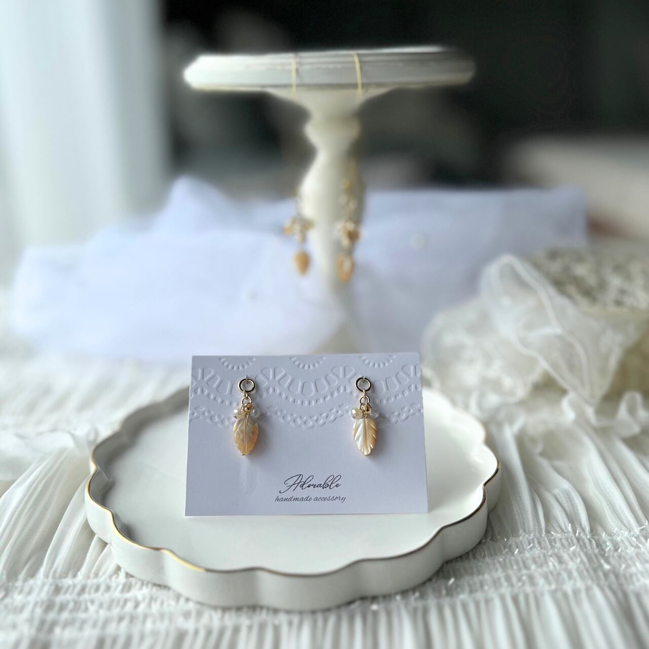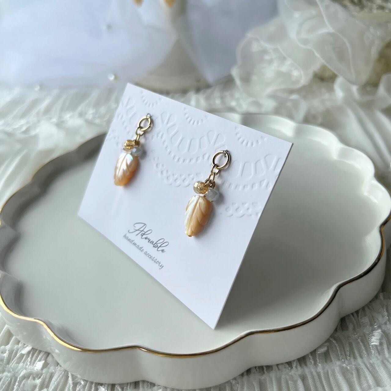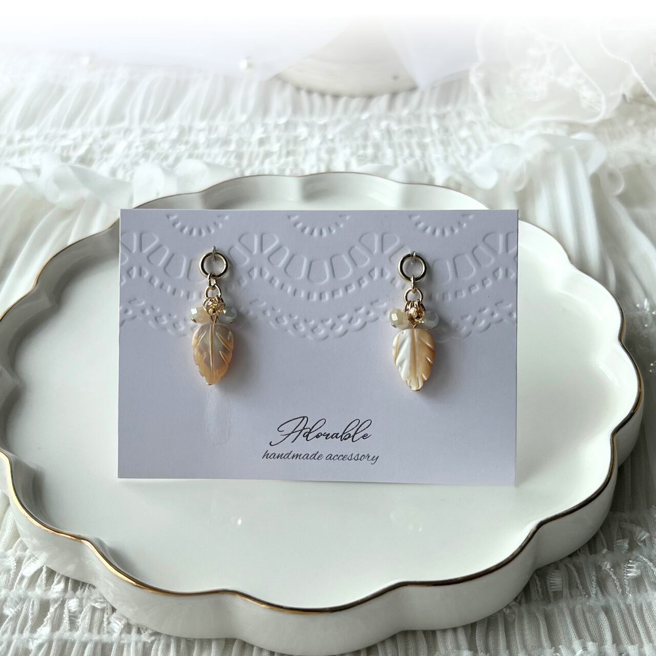 ハンドメイドのため、制作時の小さな傷等、気になる方はご購入をお控えください。また、繊細な作りのため、着脱時のお取り扱いには十分ご注意いただき、優しくお付き合いください。