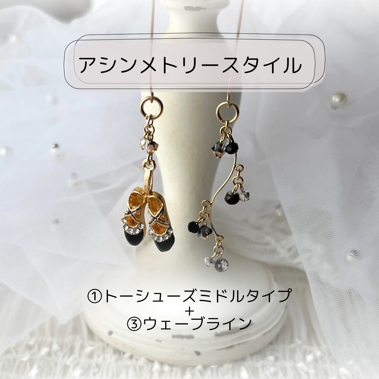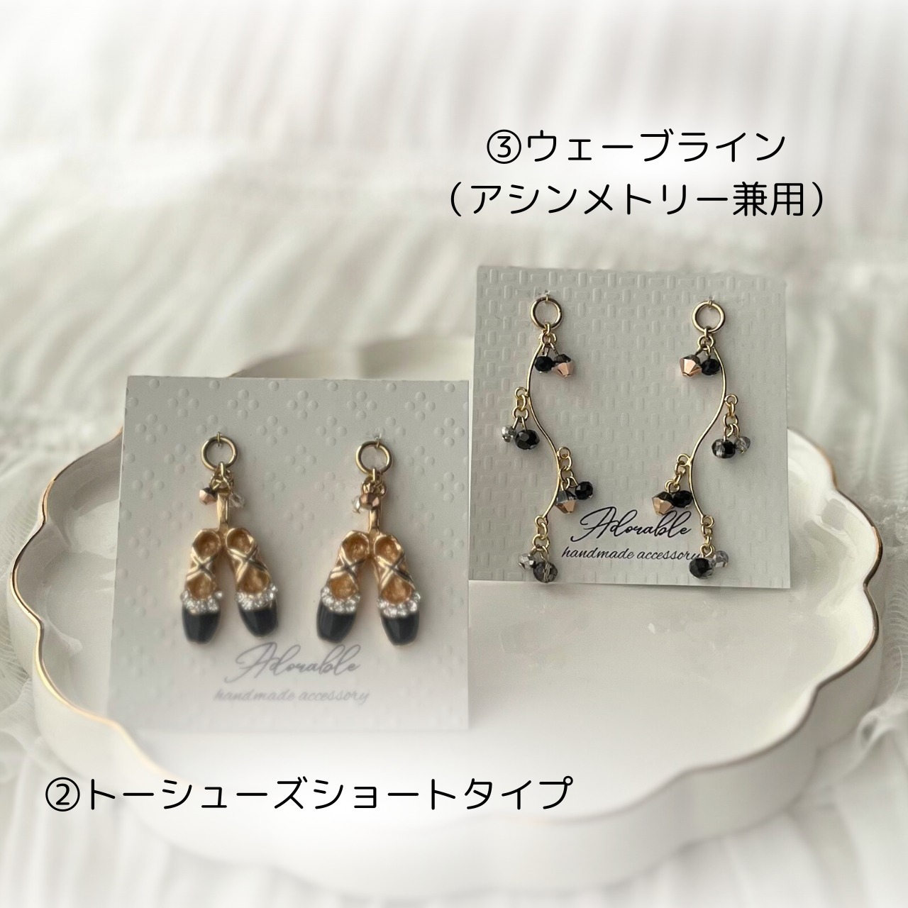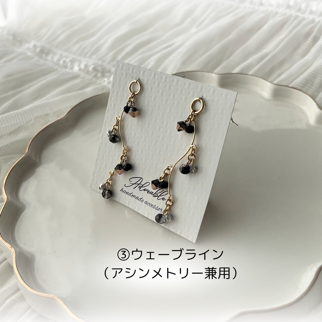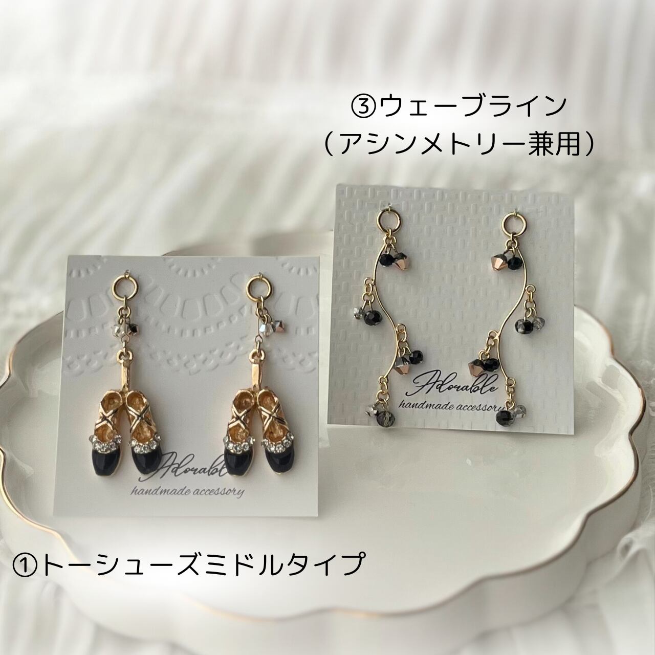 サイズ : ①ミドルタイプ長さ42mm(丸カン含)×幅16mm、②ショートタイプ長さ32mm(丸カン含)×幅16mm、③ウエーブライン(アシンメトリー兼用)(丸カン含)長さ38mm×幅13mm