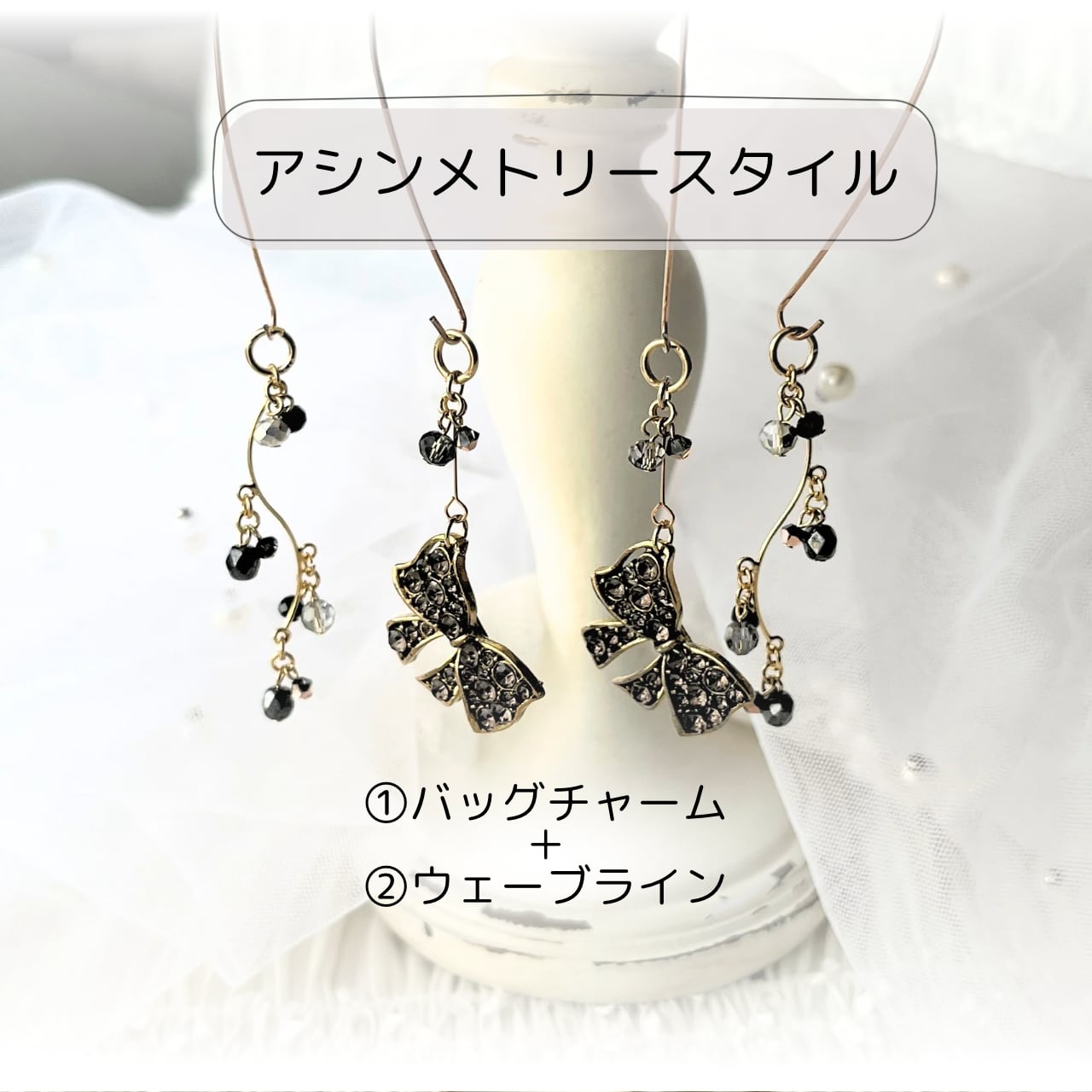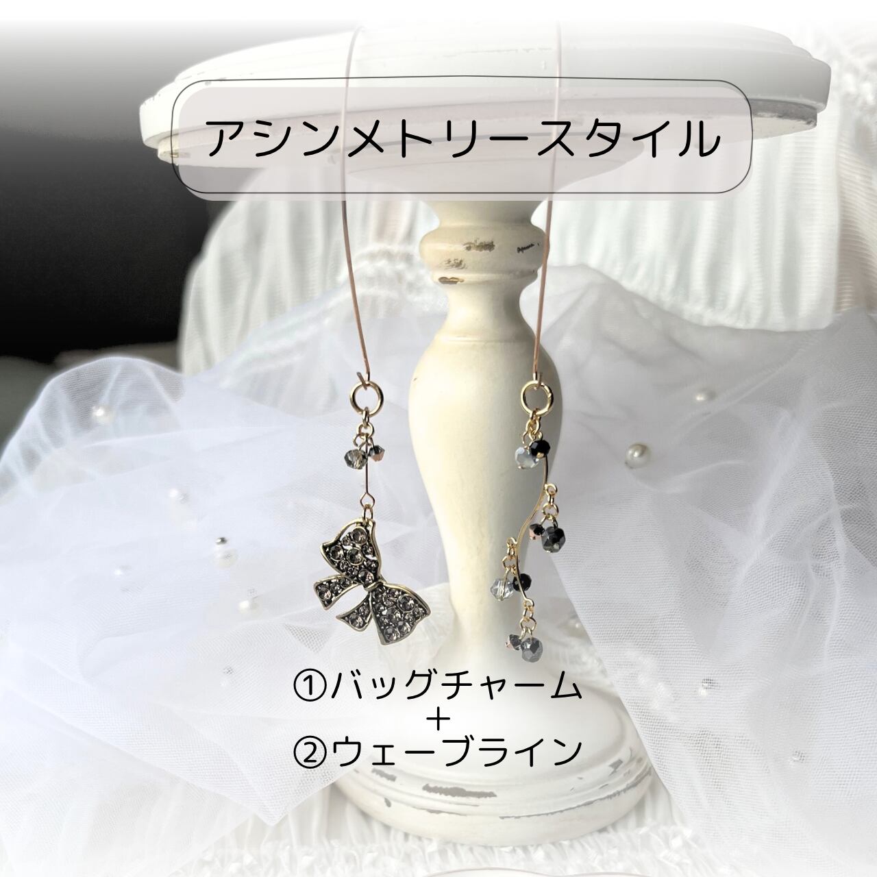 サイズ : ①バッグチャーム長さ46mm(丸カン含)×幅23mm、②ウェーブライン(アシンメトリー兼用)(丸カン含)長さ38mm×幅13mm