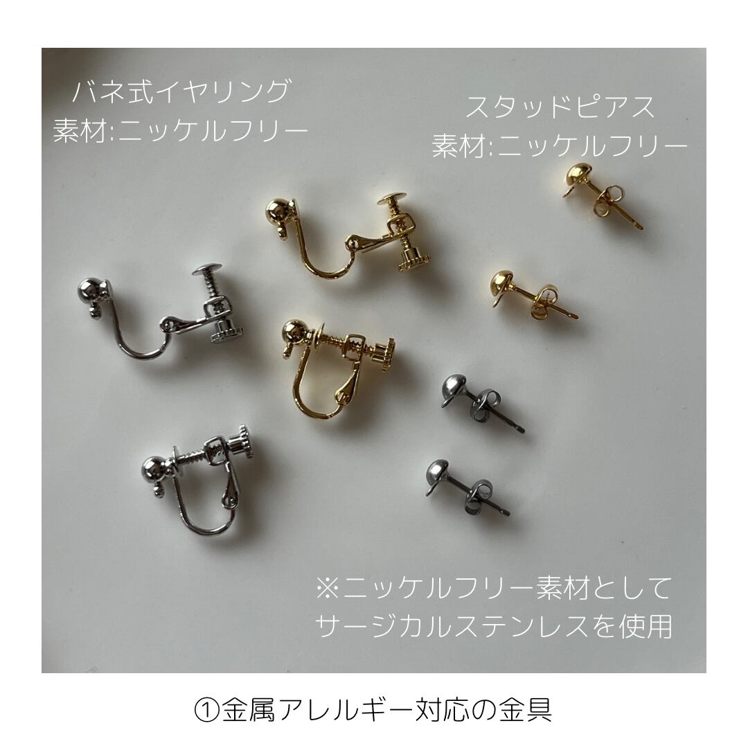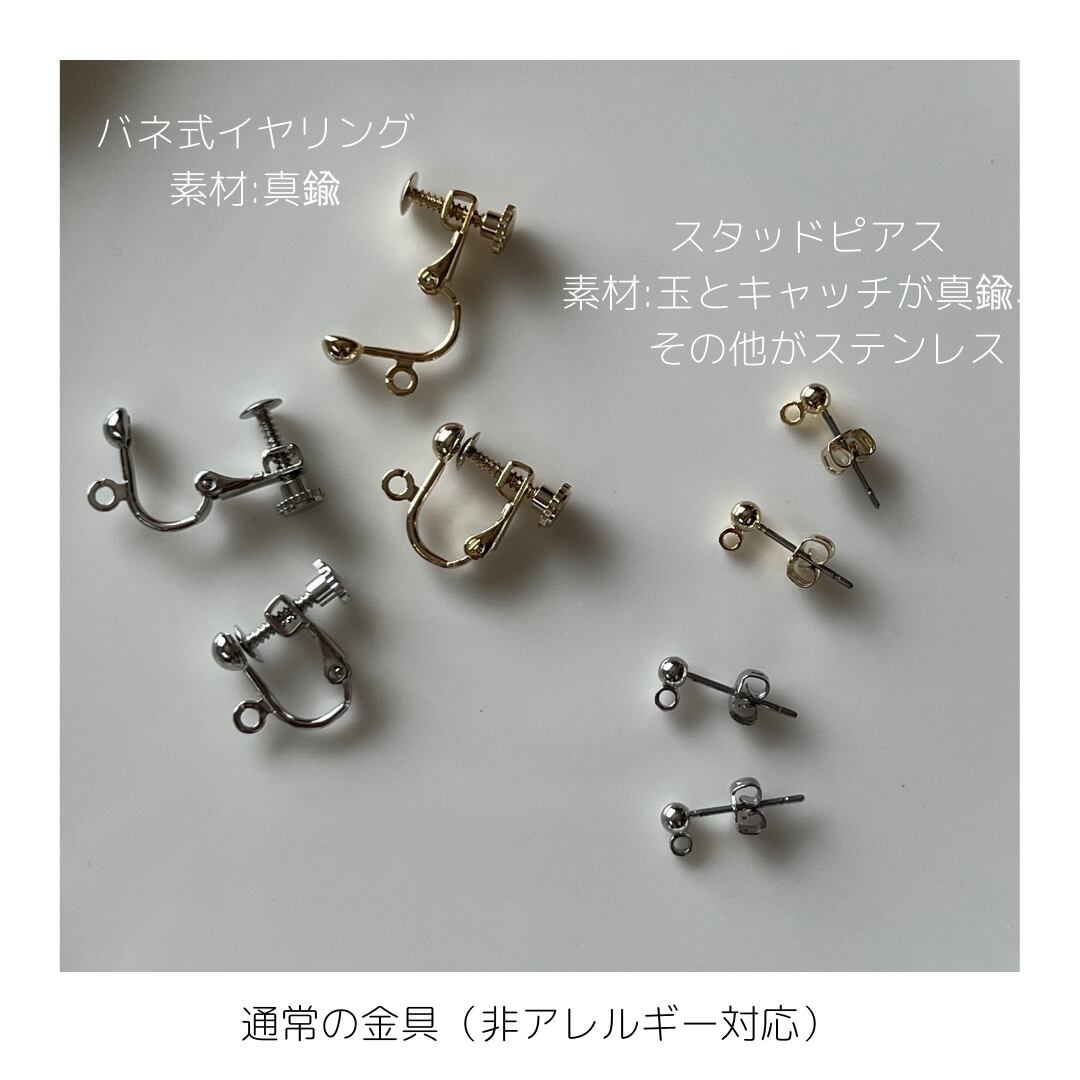 ピアスやイヤリングとしてお求めいただくお客様には、ピアス用、イヤリング用の金具に変更させていただいています。取り替えるだけで、問題なく使っていただいています。その際に、金属アレルギー対応の金具もご選択いただけます。