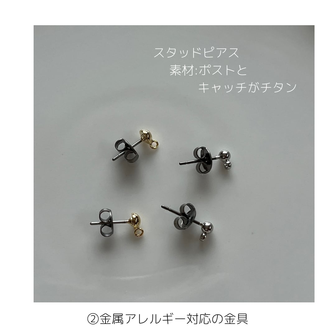 耳に触れるポスト部分とキャッチがチタンでできています。汗や水による金属の溶け出しを防ぐことが出来るため、金属アレルギーを引き起こしにくい素材です。